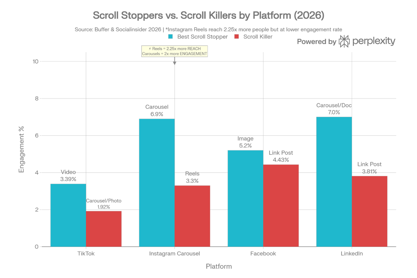 A breakdown of scroll stoppers and scroll killers by social media platform.